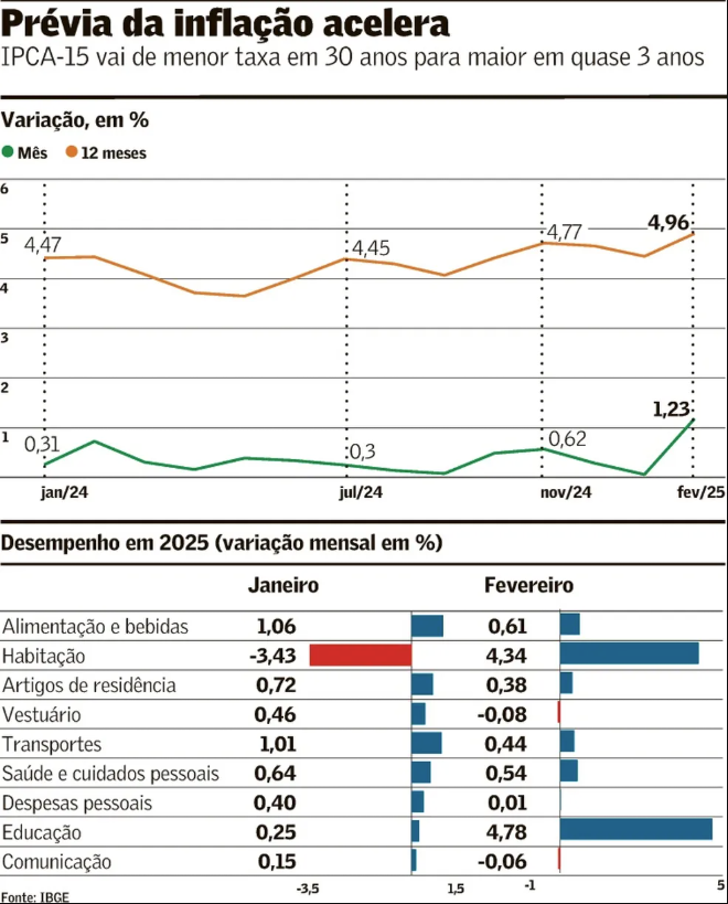O Índice Nacional de Preços ao Consumidor Amplo-15 (IPCA-15) – considerado a prévia da inflação oficial no país – subiu 1,23% em fevereiro, após alta de 0,11% em janeiro, segundo o IBGE. É a maior taxa mensal do IPCA-15 desde abril de 2022 (1,73%). Para meses de fevereiro, o aumento foi o maior desde 2016 (1,42%). Com o dado de fevereiro, o IPCA-15 acumula alta de 4,96% em 12 meses.